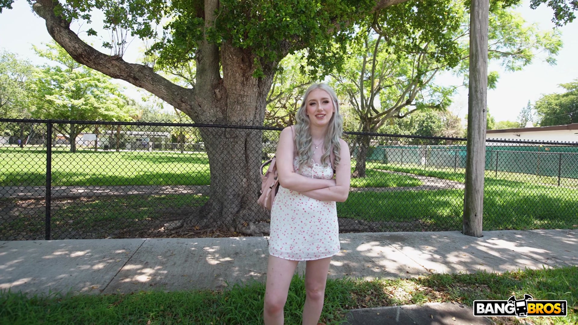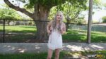 Izzy Rae stands outdoors in her short white polka-dot dress before climbing into the Bang Bus. Once inside she strips completely, spreading …